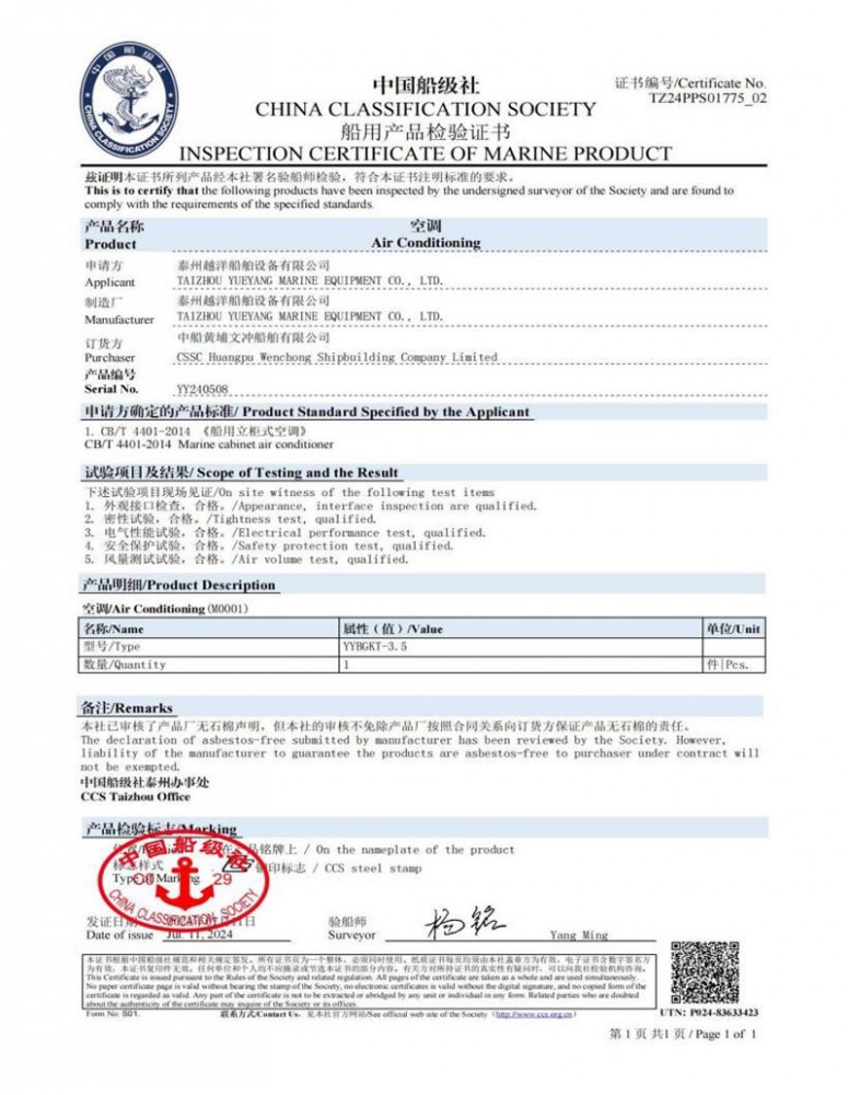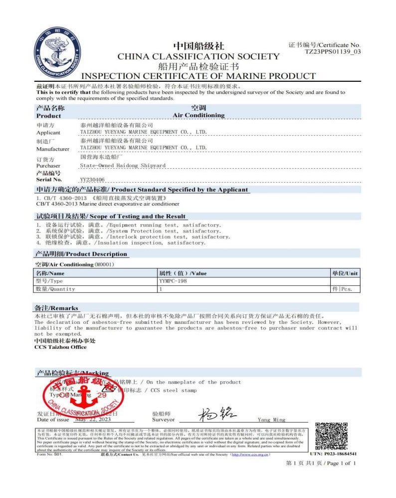 泰州越洋船舶設備有限公司多年專業從事艦船用空調、冷藏、冷凍設備、冷庫系統,通風安裝系統(空調通風,機艙通風,自然通風)等。本公司地處美麗的曲霞鎮工業園區,固定資產1200萬人民幣,占地面積1.5萬平方米左右,公司產品廣泛用于海軍驅逐艦護衛艦,補給艦,海警,醫療船,科考船等,如:“東方紅2“,“海大號”,“向陽紅06”,“向陽紅09”,“向陽紅03”,“大洋1號”,“東方紅3”,“向陽紅18”,“向陽紅52”,地質級科考船“業冶錚”號海洋平臺。